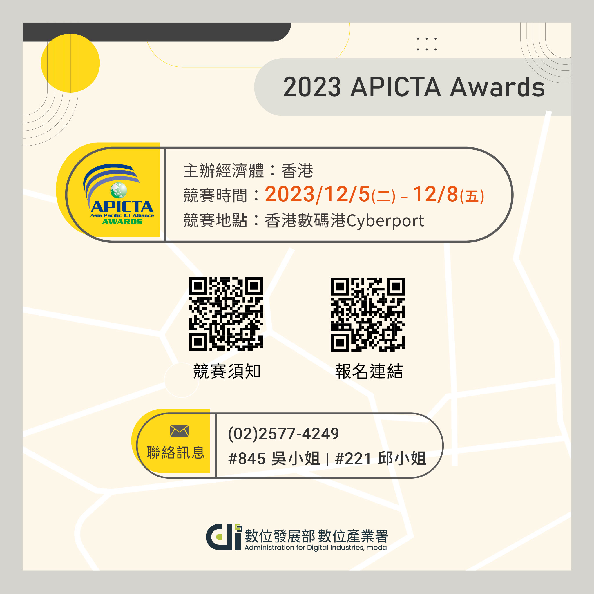 2023 APICTA Awards 將於12月5日(二)至12月8日(五)在東方之珠-香港實體舉辦!歡迎有興趣、有實力、有膽識的優秀團隊一起加入臺灣代表隊的陣容,跟著我們一起出國爭光。