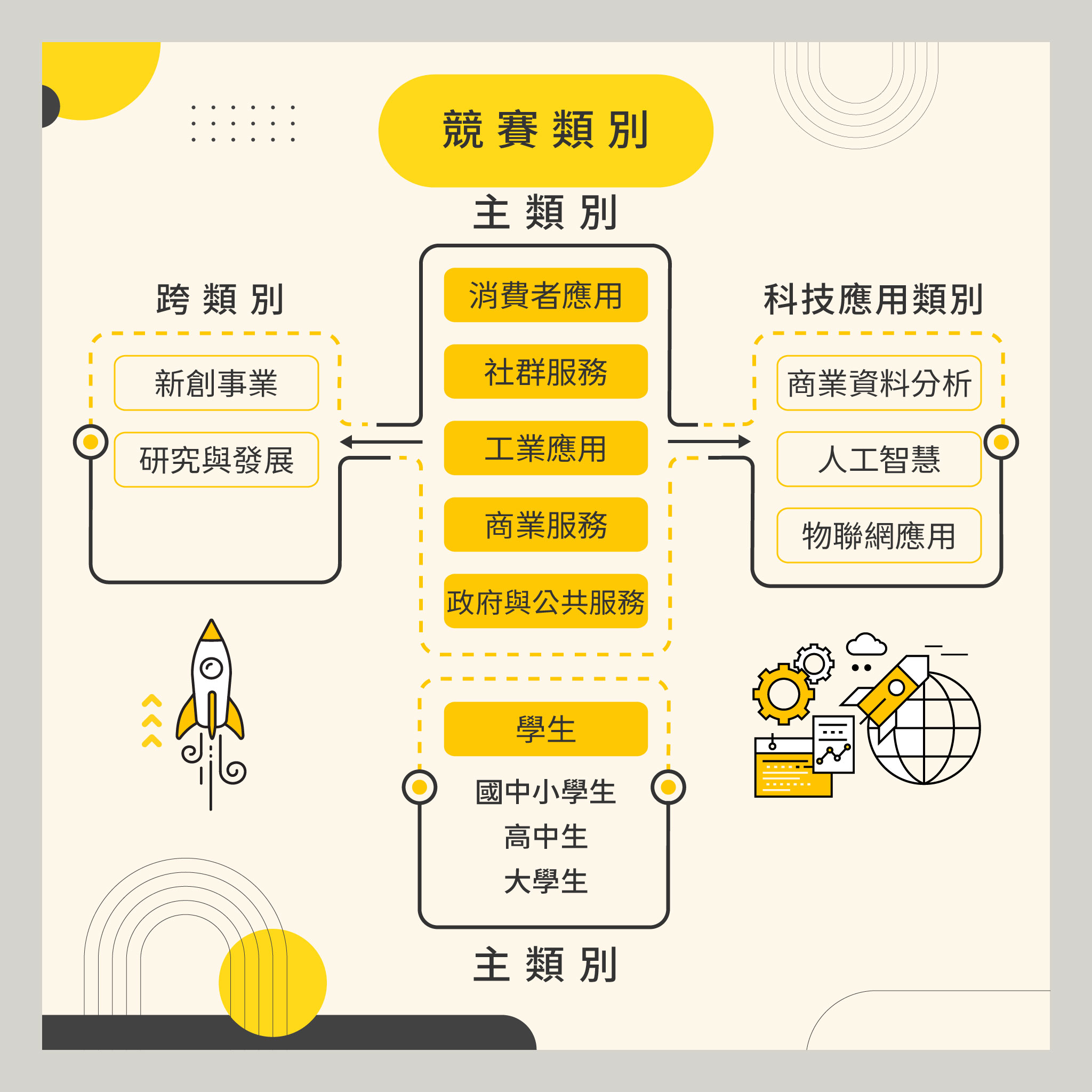 ❻大主類別: 消費者端應用、社群應用、工業應用、商業服務應用、公共與政府應用、學生組(大學生組、高中組、國中小學生組)