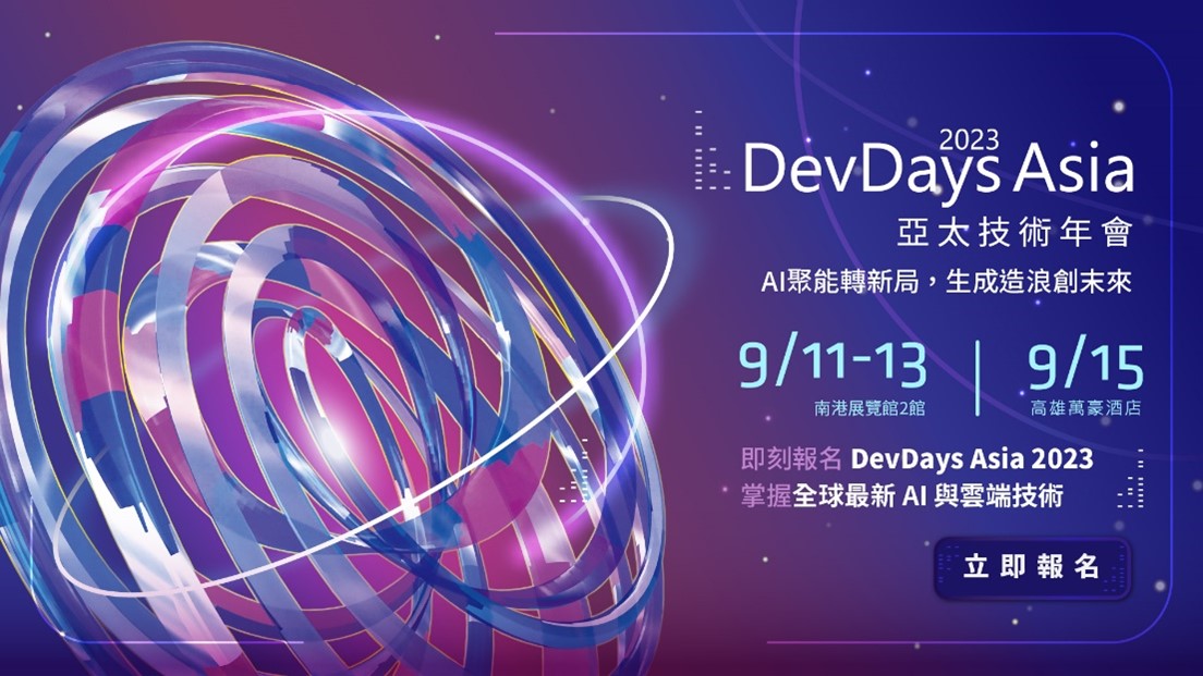 數位發展部數位產業署積極推動產業AI化與AI產業化,協助臺灣各行各業因應數位經濟時代所帶來的挑戰與機會,在科技浪潮中站穩潮流奪得商機。今年「DevDays Asia 2023 亞太技術年會」將於9月11日至9月13日在南港展覽館二館、以及9月15日在高雄萬豪酒店盛大展開,來自微軟總部的技術首席與專家團隊與臺灣產業夥伴共同互動交流,激盪出翻轉世界的驚人技術能量。