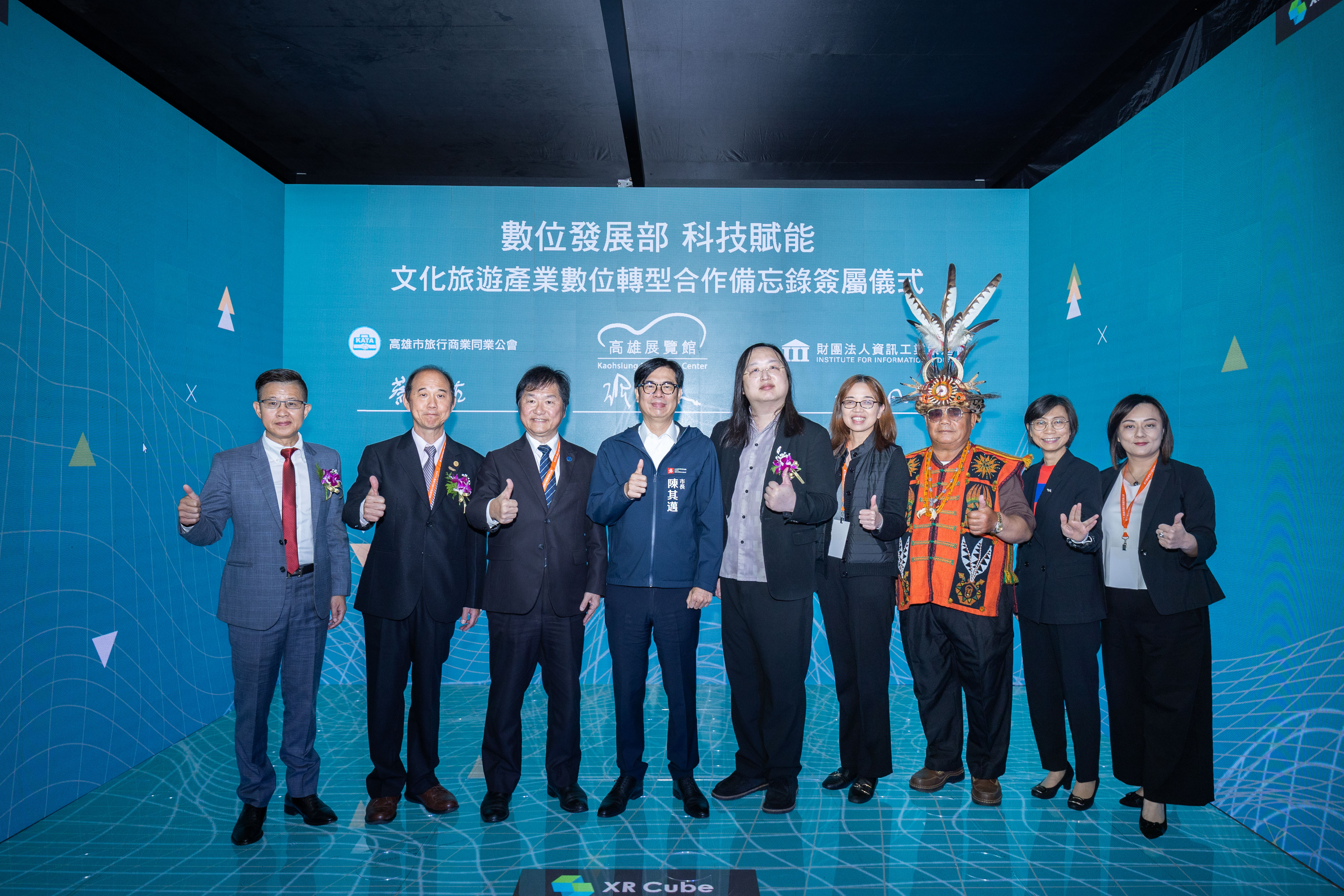 因應數位經濟時代的挑戰與機會,數位產業署致力協助及推動各行各業增強數位韌性。此次資策會與高雄旅行公會在高雄冬季國際旅展中,建置「5G Empower山海。島遊」展區,將臺灣各地山海風景文化(如北大武山、馬祖藝術島、津冬酒祭等)與科技應用服務結合,讓參觀民眾化身時空旅人,在虛擬空間即可優遊山海風情。另外,活動現場邀請高雄市長陳其邁、數位部部長唐鳳、交通部祈文中常務次長及高雄旅行公會理事長蔡宗佑、資策會數轉院院長林玉凡等貴賓蒞臨,共同見證資策會數位轉型研究院與高雄市旅行公會簽署合作備忘錄(MOU),帶動高雄文化觀光旅遊相關業者進行數位轉型。