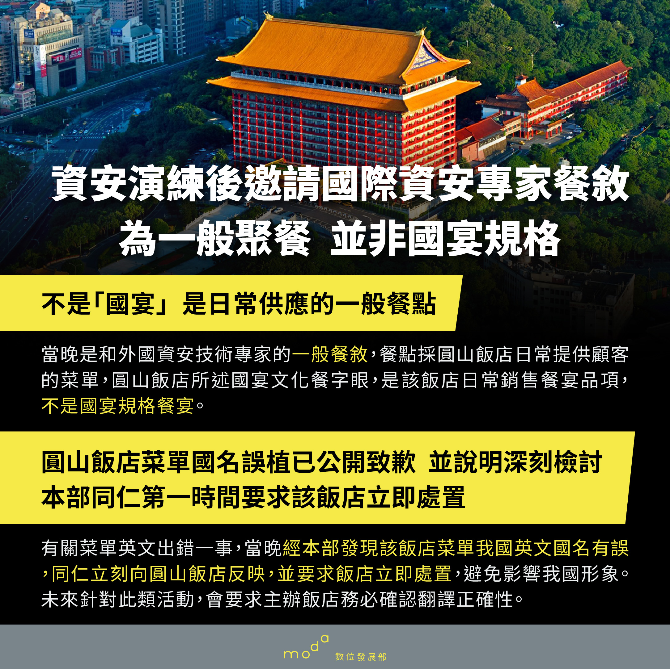 有關菜單英文出錯一事,當晚經本部資安署發現該飯店菜單我國英文國名有誤,同仁即刻向圓山飯店反映,並要求該飯店立即處置,避免影響我國形象。未來針對此類活動,會要求主辦飯店務必確認翻譯正確性。