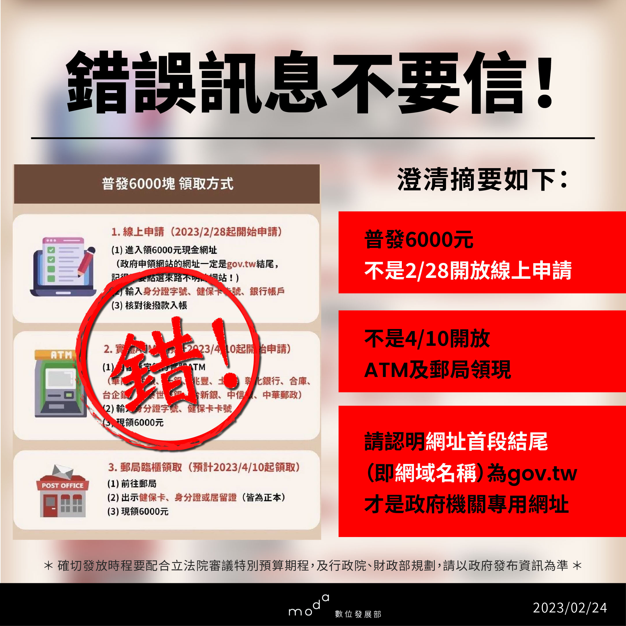 有關網路流傳「全民共享 普發現金」6000元將於2月28日開放線上申請,以及4月10日開放ATM及郵局領現等資訊,相關日期資訊都不正確。