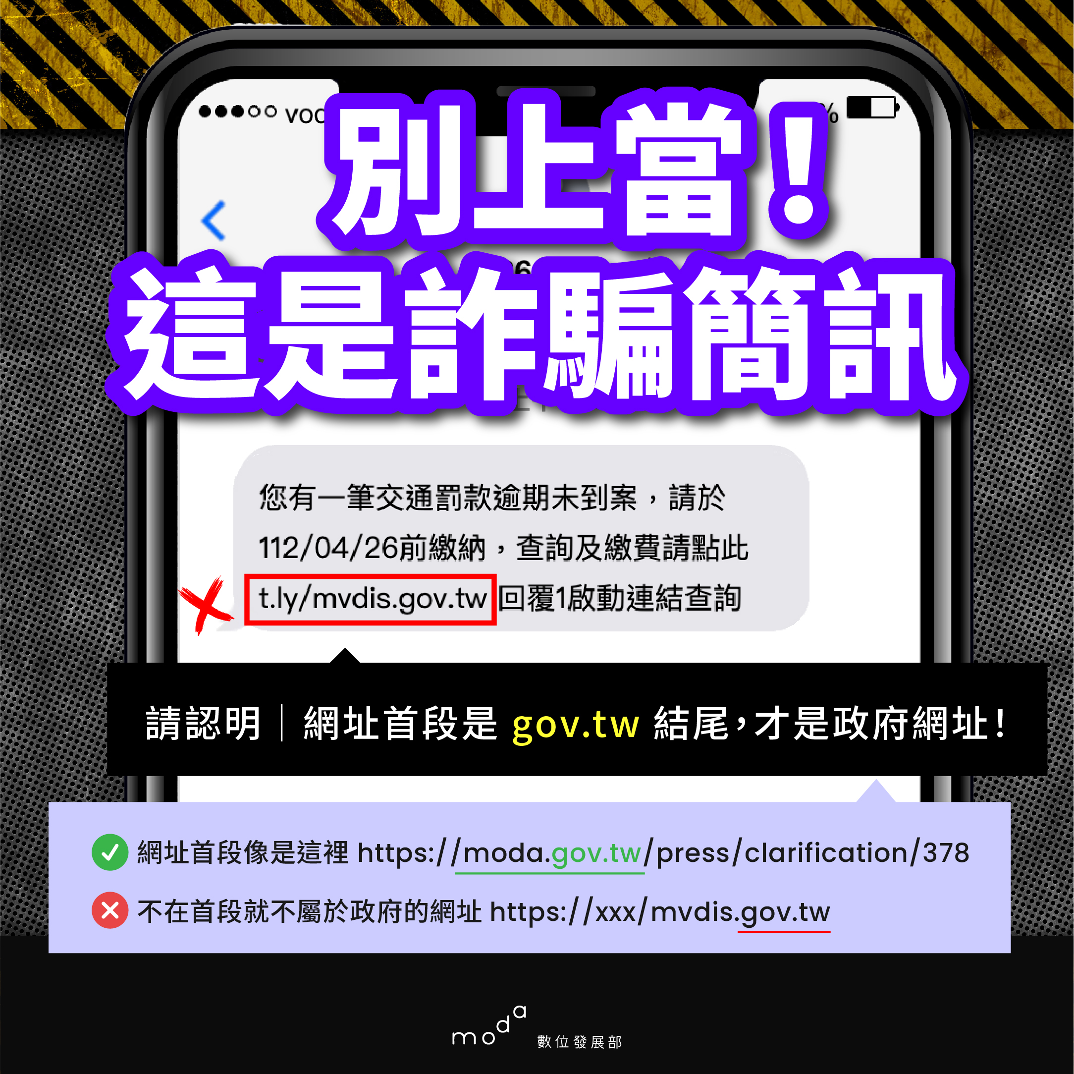 最近網路上有傳出民眾收到未繳交通罰款的詐騙簡訊,簡訊上用偽造的監理服務網,並且刻意混淆,以民間商業縮網址服務加上不屬於政府網站的網址結尾改為「gov.tw」,意圖冒充政府專用網域 https://gov.tw/ 。