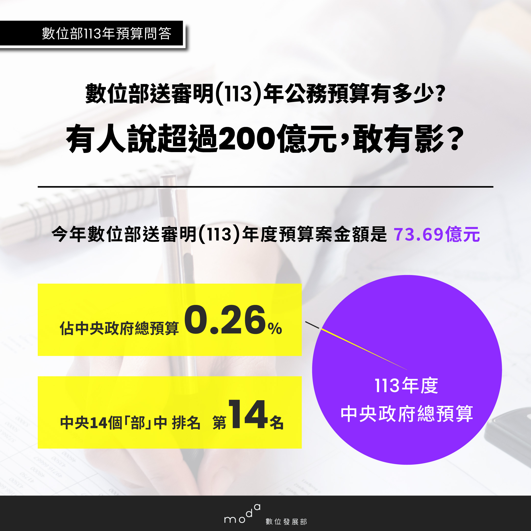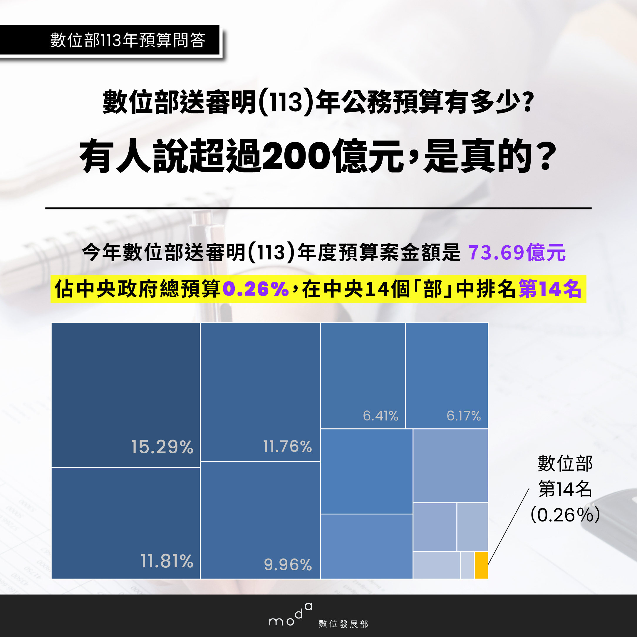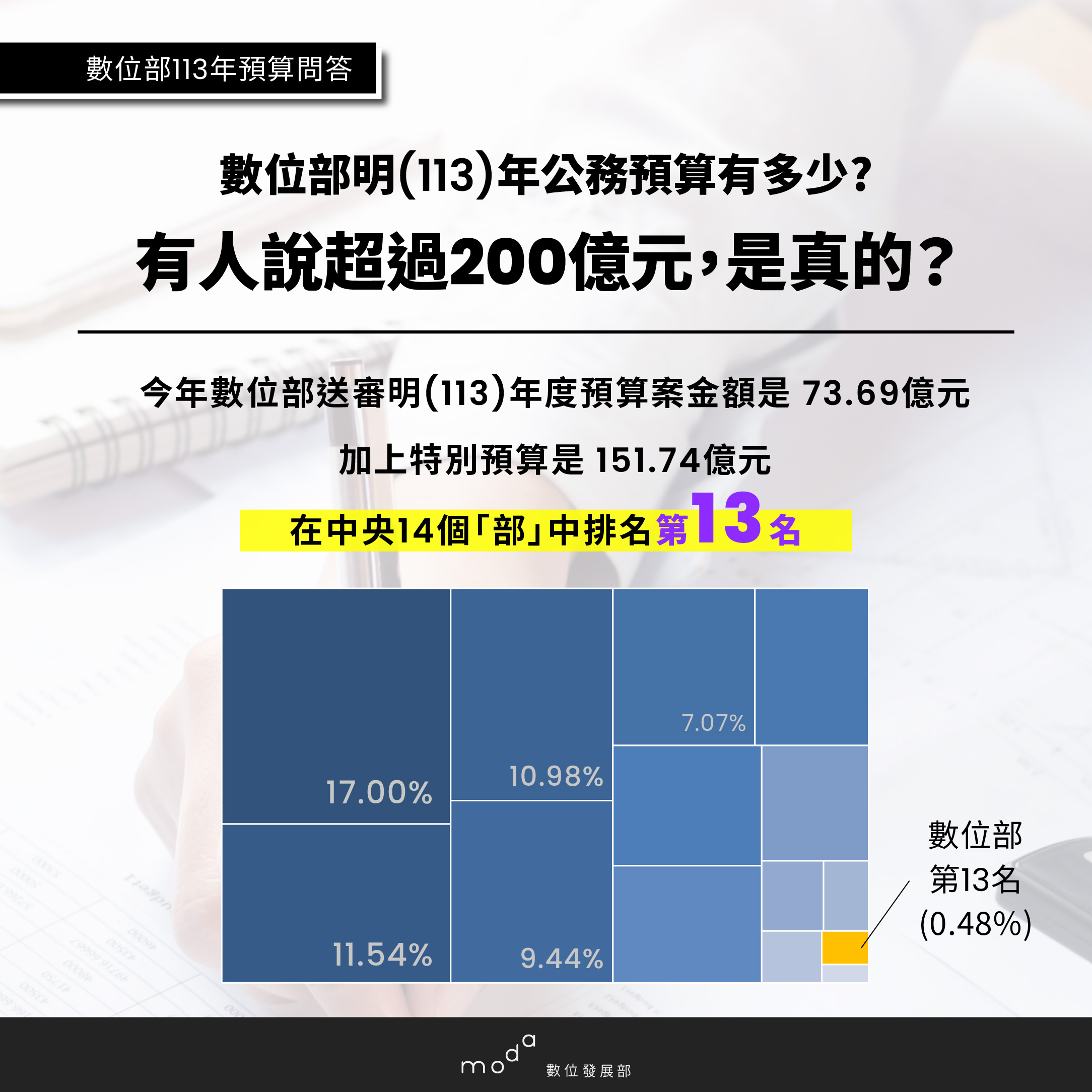 數位部明(113)年度預算案金額是 73.69億元,佔中央政府總預算2 兆 7,092 億元中 0.26%,在中央14個部中排名第14名;另加上特別預算金額為 151.74億元,在中央14個部中排名第13名。