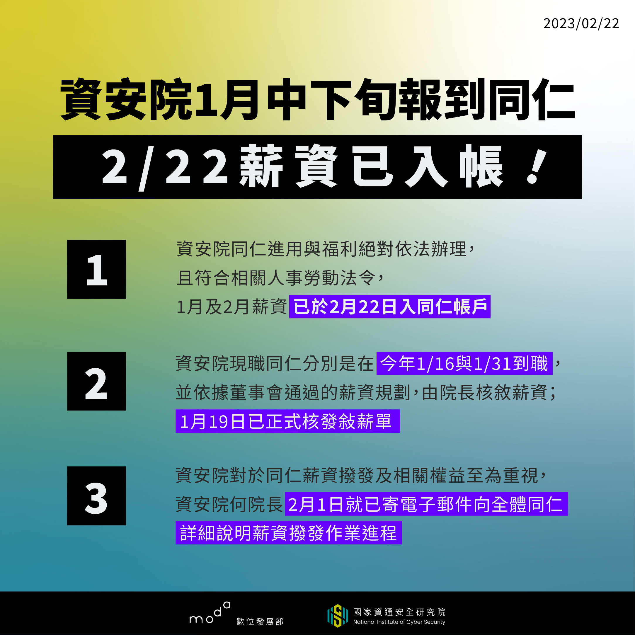 有關地方民代關切資通安全研究院(以下簡稱資安院)同仁人事相關制度及福利事項,資安院相關計畫及預算作業程序正陸續完成,1月及2月薪資已在2月22日入同仁帳戶,後續薪資都將依規定準時撥付。