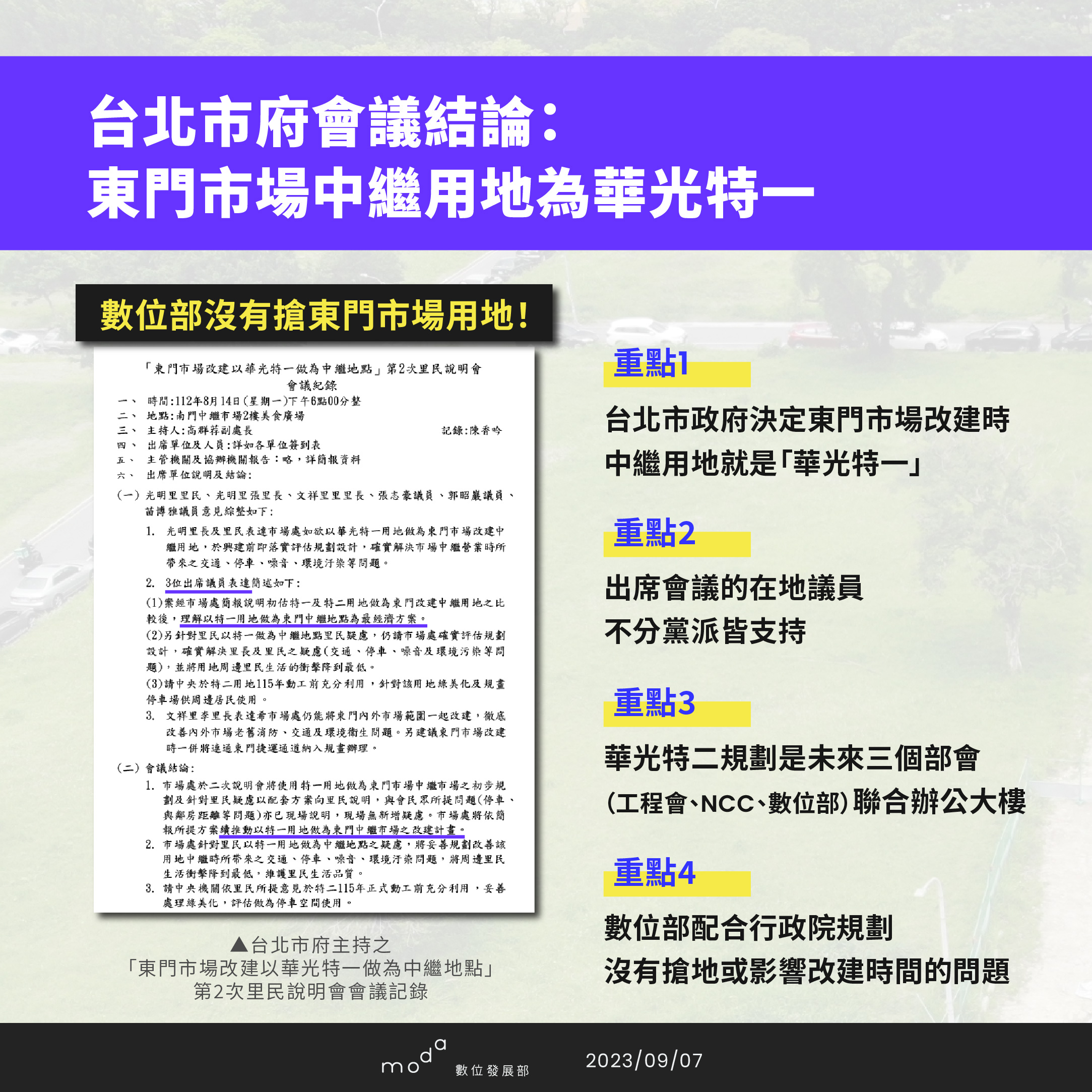 依據今(民國112)年8月中,台北市府所主持召開的「東門市場改建以華光特一做為中繼地點」第2次里民說明會會議記錄,會議結論清楚寫明,東門市場中繼用地為「華光特一基地」。這個結論獲得出席會議的在地議員不分黨派支持,並理解以「特一用地作為東門中繼地點是最經濟方案,北市府市場處也表示將繼續推動「華光特一」做為東門市場中繼用地。這與公共工程委員會、國家通訊傳播委員會與數位發展部等三個部會聯合辦公大樓的預定地「華光特二基地」不同,所以沒有跟東門市場中繼用地搶地的問題,更不會對東門市場改建產生干擾。