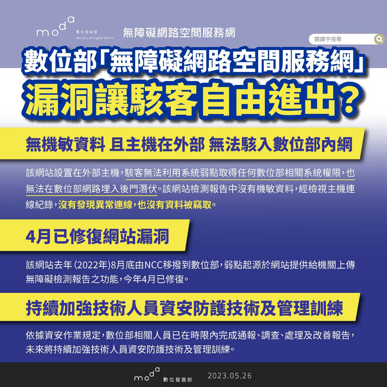 有關新聞報導駭客能透過「無障礙網路空間服務網」系統弱點控制數位部主機一事,數位部澄清如下: