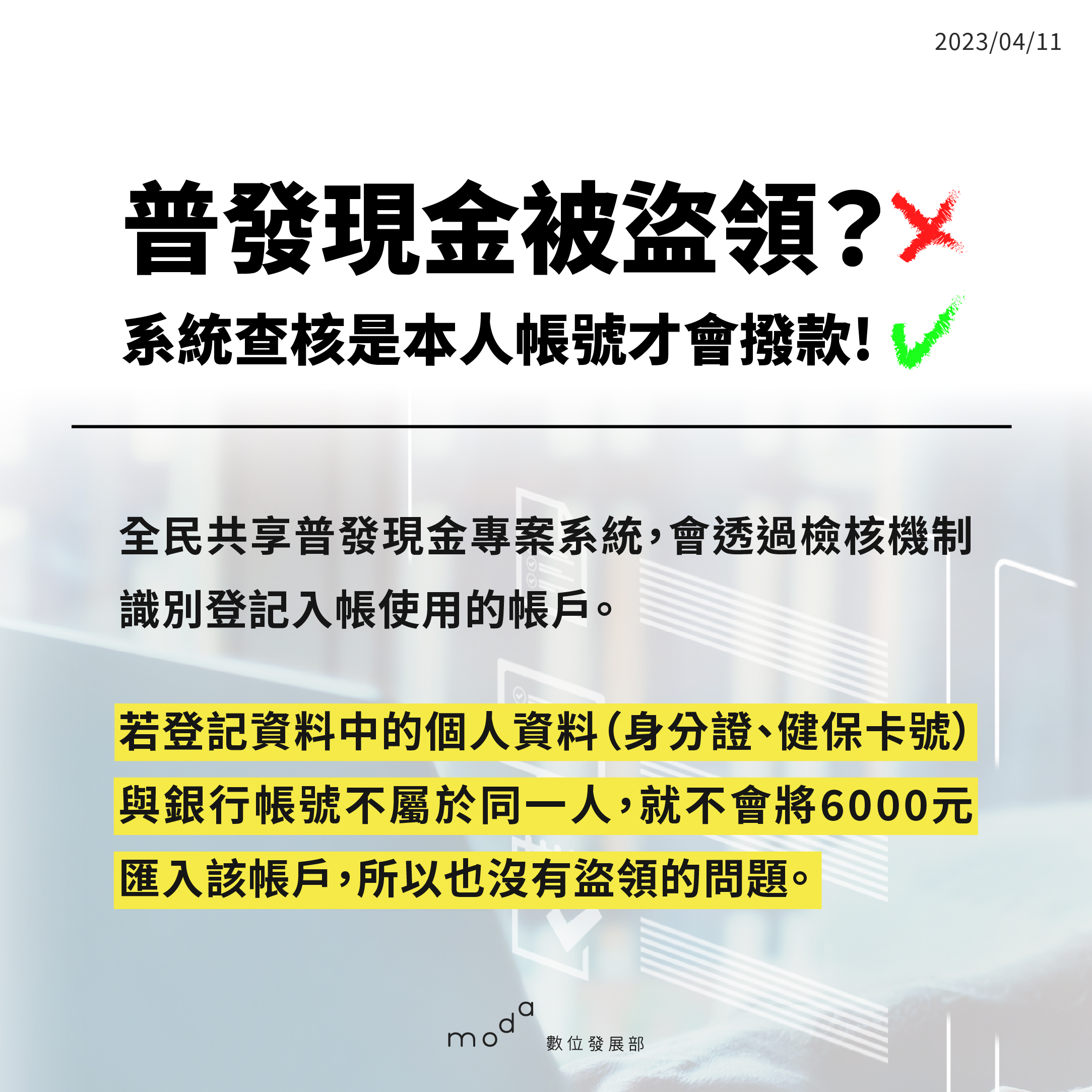 數位部在此提醒,本次全民共享普發現金6000元專案,會需要領取民眾的身分證號碼、健保卡號與提領帳戶皆屬同一人,即是為了防止有心人士偽冒他人證件號碼而盜領款項。