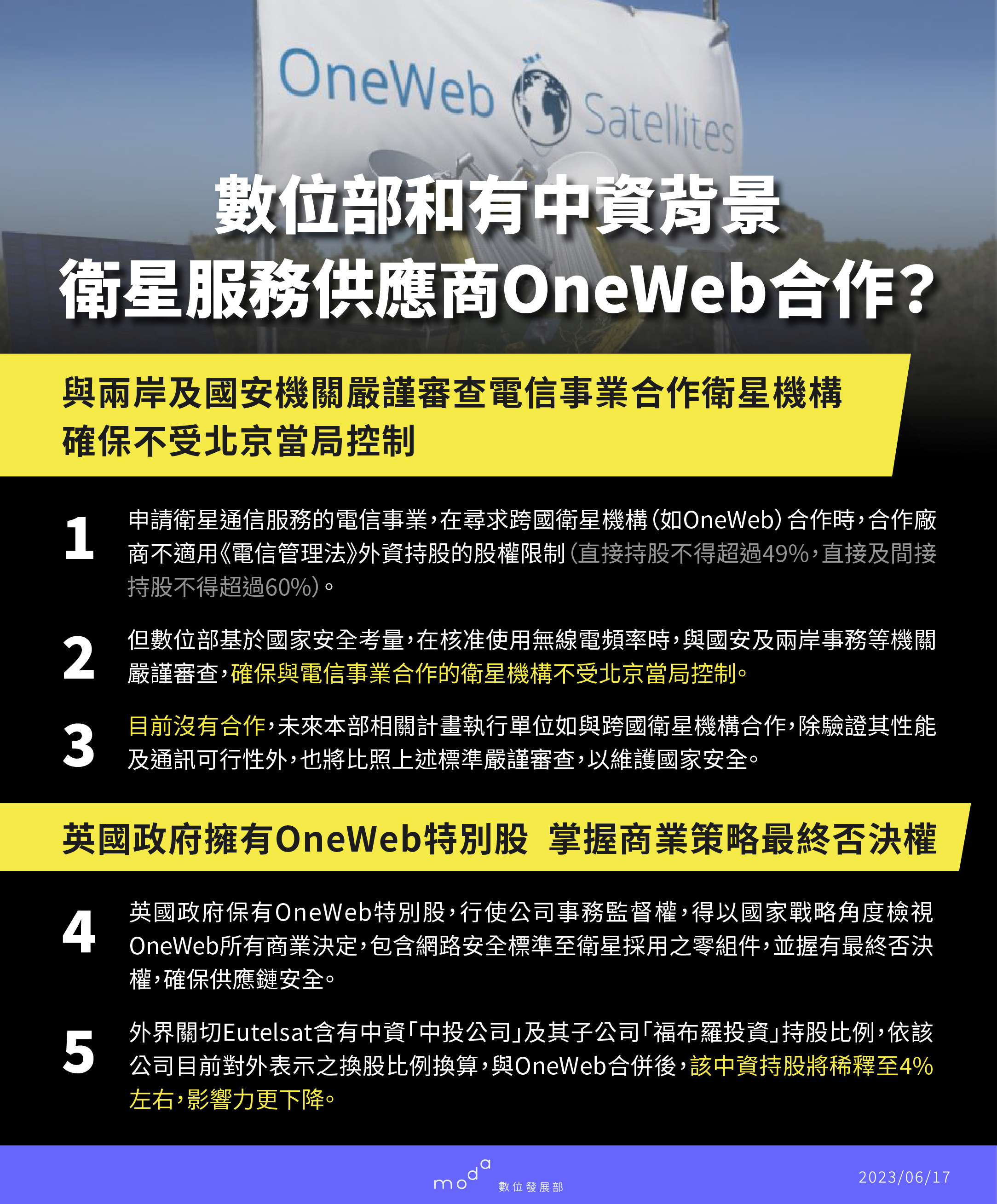 有關外界關切Eutelsat含有陸資「中投公司」及其子公司「福布羅投資」合計約8.3%的持股比例,依該公司目前對外表示之換股比例換算,其與OneWeb合併後,該持股將稀釋至4%左右,影響力更為下降。而英國政府保有OneWeb特別股,行使公司事務監督權,得以國家戰略角度檢視OneWeb所有商業決定,包含網路安全標準至衛星採用之零組件,並握有最終否決權,確保供應鏈安全。