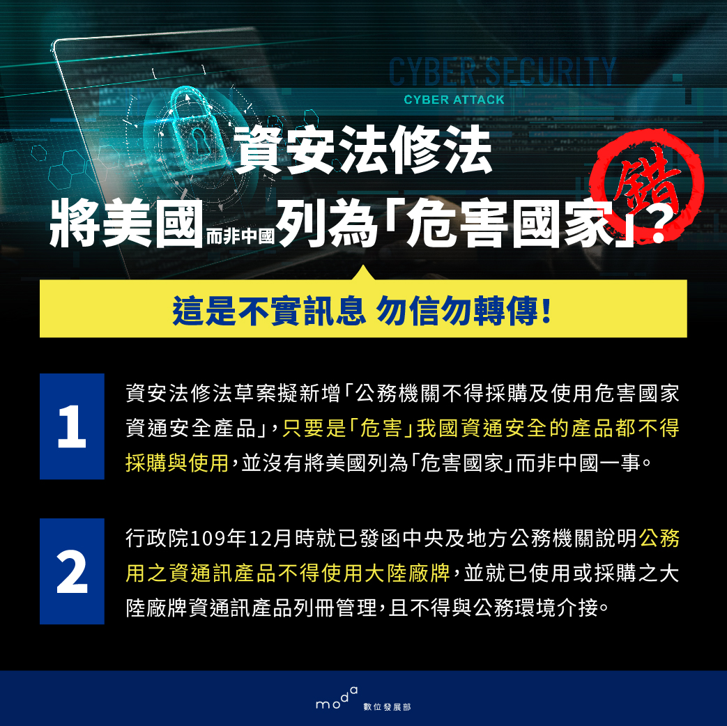 數位部強調,資安法修法草案擬將「各機關對危害國家資通安全產品限制使用原則」的行政原則入法,新增「公務機關不得採購及使用危害國家資通安全產品」,只要是「危害」我國資通安全的產品皆不得採購與使用。並沒有將美國列為「危害國家」而非中國一事。
