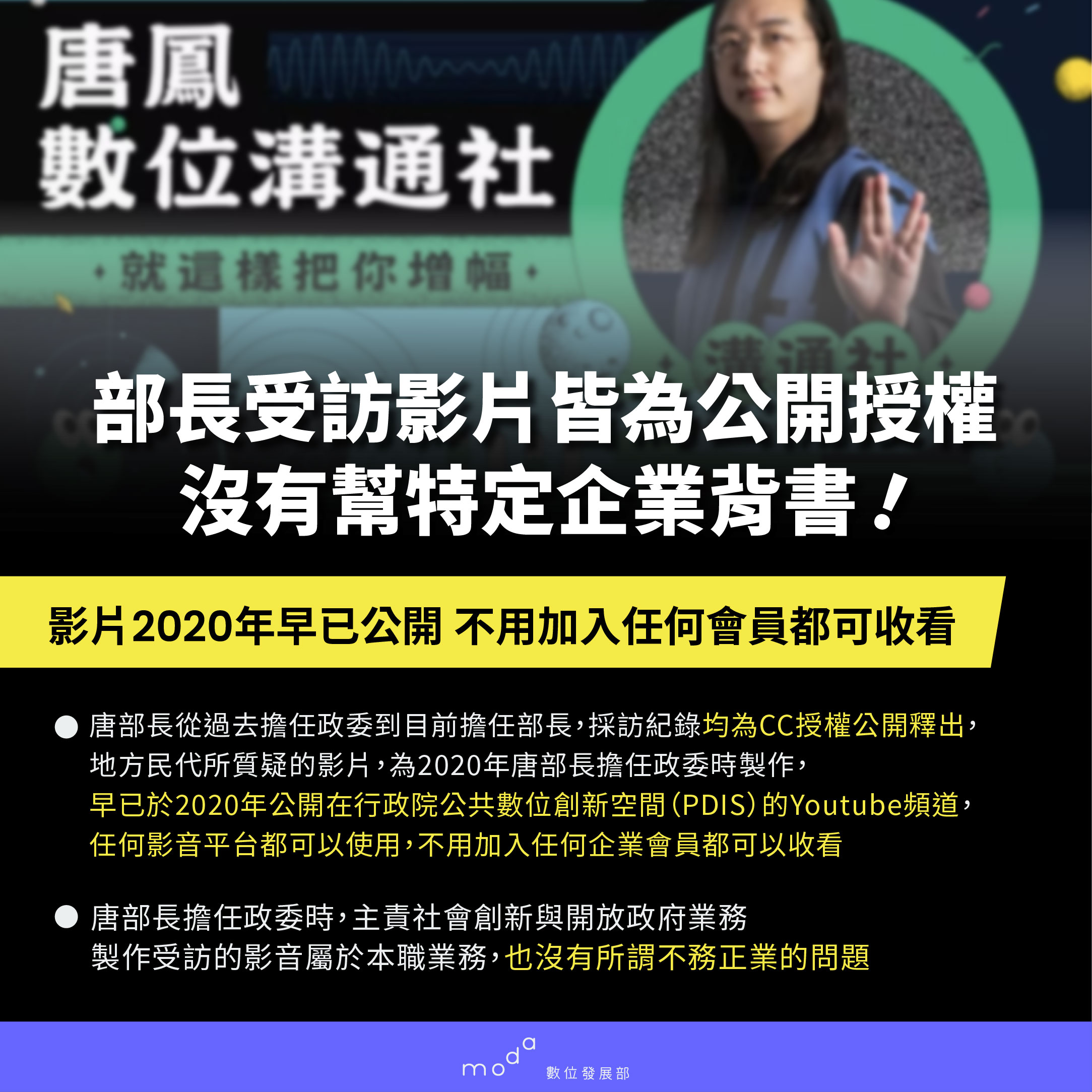 有關近日民意代表質疑唐鳳部長替私人公司拍片、不務正業,數位發展部表示,唐部長從過去擔任政委到目前擔任部長,採訪紀錄均以CC授權公開釋出,地方民代所質疑的影片,為2020年唐部長擔任政委時製作,早已於2020年公開在行政院公共數位創新空間(PDIS)的YouTube頻道( https://www.youtube.com/watch?v=PUrtURGFwZQ ),當時就是以CC授權公開釋出,任何影音平台都可以使用,不用加入任何企業會員都可以收看,沒有幫特定私人通路背書的問題。