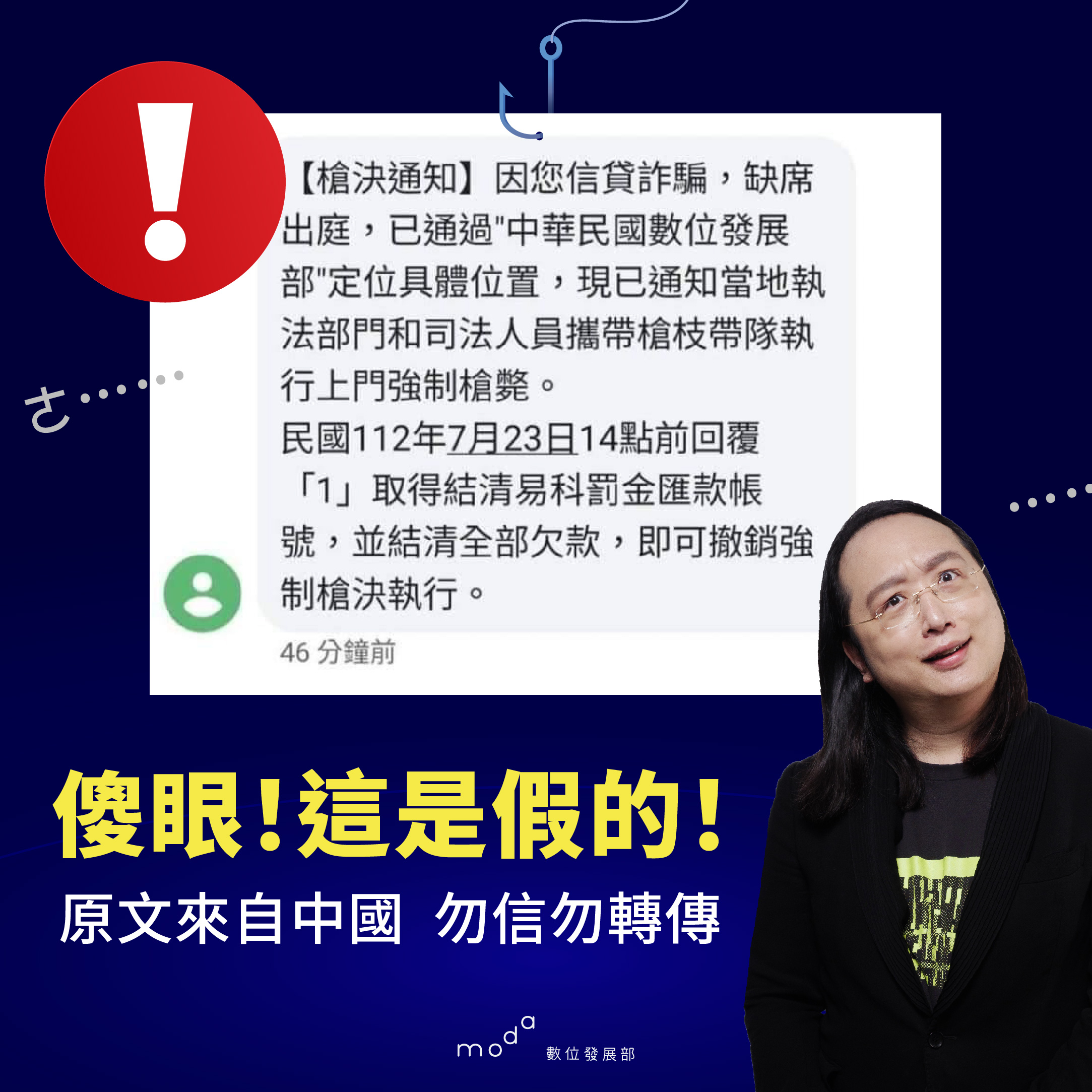 近日網路上有傳出民眾收到詐騙簡訊,指民眾因涉案未出庭,執法人員會根據數位部的定位資訊,前往當事人的所在地進行槍決。數位部嚴正澄清,這是詐騙簡訊,內容源自於中國詐騙簡訊改編。