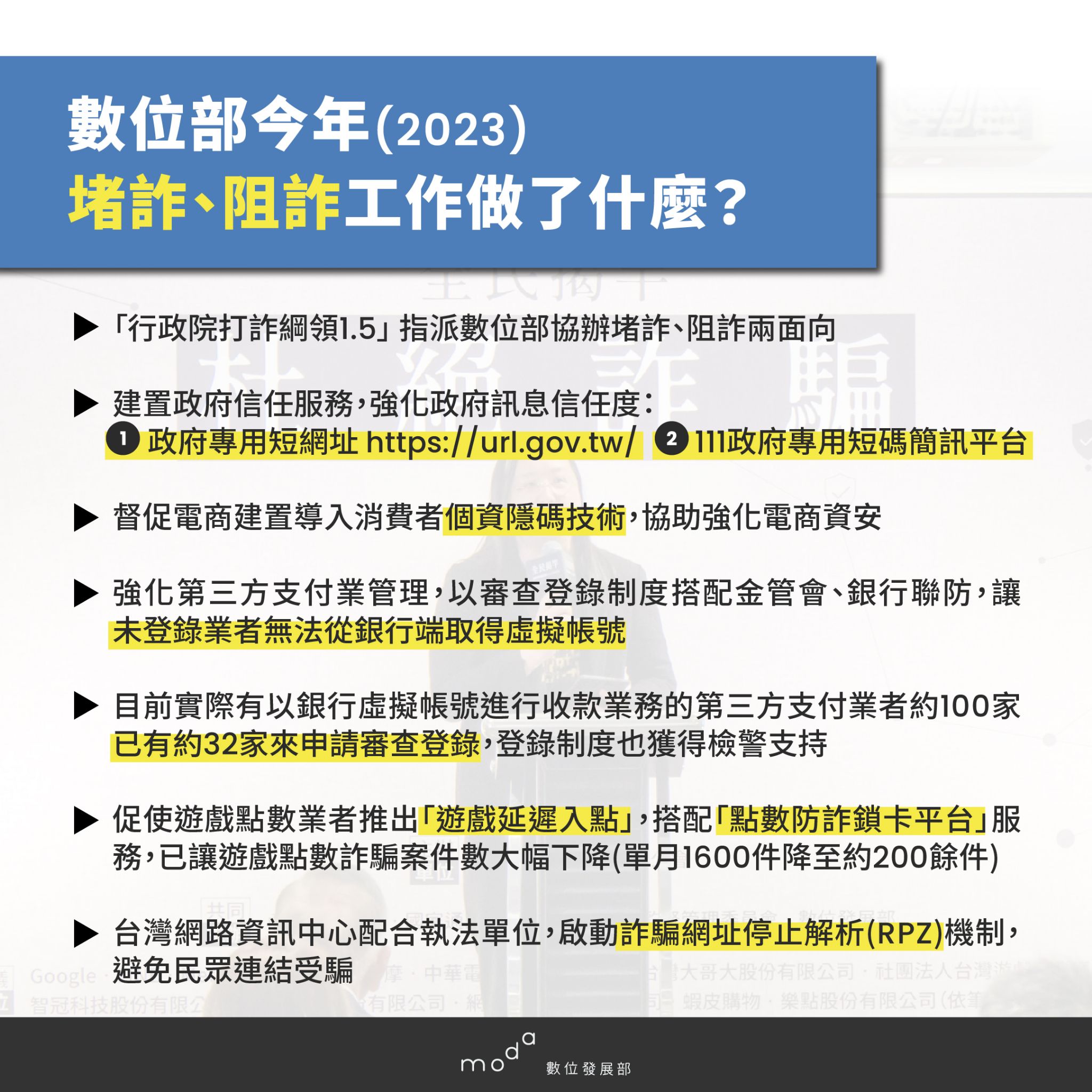 李懷仁也指出,數位部已協助檢警調機關與Meta、Google建立聯繫管道,與Meta建立「綠色通道」下架涉詐廣告,與LINE公司研議建置「紅色通道」下架涉詐帳號,與Google建立打詐聯繫管道,加速冒名投資廣告下架;並與金融監督管理委員會合作,要求第三方支付業者進行能量登錄,未完成登錄業者,銀行可認定為洗錢防制之高風險業者,終止其虛擬帳戶服務;另外,為讓民眾判別政府資訊的真實性,數位部已建立111政府專屬短碼簡訊平臺,做為行政部門發送簡訊的信賴管道,藉此避免民眾被假冒政府機關的簡訊所騙,保護自身財產安全。